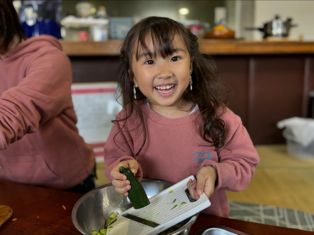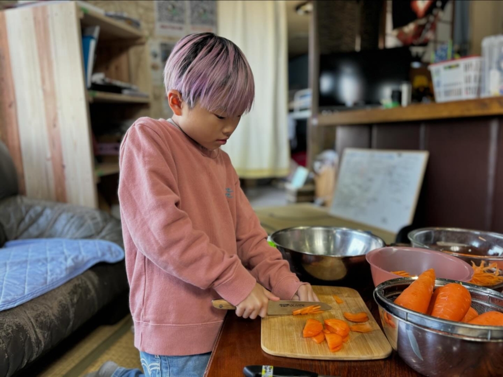 小学3年生の男の子は炊き込みご飯の人参を切ってくれて、5歳の女の子はスライサーでサラダのきゅうりを切ってくれました![]()